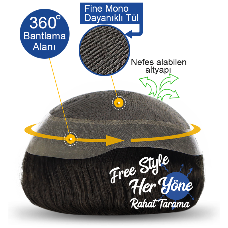 %100 Gerçek insan saçlarından üretilmiş Angel Modeli Kadın Protez Saçın orta bölümü fine mono dayanıklı tül olduğundan, hava ve su geçirgenliğine sahiptir. Bu sayede kafa deriniz oksijen alır ve derinizin su ile teması sağlanır. Ön kısımlardaki 1 cm lik bölüm doğallık için RSK tek düğümdür. Bu sayede Saç dipleri ve düğüm yerleri, alın bölgenize %100 Doğal bir görünüm kazandırır. Geri kalan bölümde DRSK çift düğüm kullanılmıştır. 360 derece pu. bantlama bölümü sayesinde her açıdan mükemmel tutuş gücü sağlar. Ön bölümdeki poly, kullanıcının ölçülerine göre kesilebilir.45-50 cm saç uzunluğuna sahip Free Style Angel Protez Saç Modeli ipeksi yapısı ve yönsüz oluşu sayesinde her modele rahatlıklar girer, kolay taranır. İster arkaya tarayın ister yanlara, her durumda da mükemmel sonuçlar alırsınız. Fön, Maşa ve Sprey kullanabilirsiniz. Daha çok kendi bakımını kendisi yapmak isteyenler için tercih sebebidir.