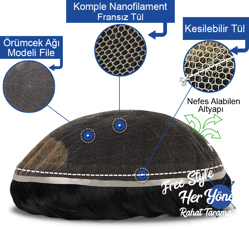 %100 Gerçek insan saçlarından üretilmiş Falugnaft Modeli Protez Saç, komple nanofilament tül olduğu için %100 hava ve su geçirgenliğine sahiptir. Bu sayede kafa deriniz oksijen alır ve derinizin su ile teması sağlanır. Ön kısımlardaki 4 cm lik bölüme Hair Bleaching tekniği ile saç ağartma uygulanmıştır. Bu sayede Saç dipleri ve düğüm yerleri, derinizin rengi ile aynı renkte görünür, alın bölgenize %100 Doğal bir görünüm kazandırır. Ön bölümdeki nanofilament tül, kullanıcının ölçülerine göre kesilebilir. Ön tül bölümde 1 cm lik bir bölüm doğallığın arttırılması için RSK tek düğüm ile işlenmiştir. Geri kalan bölümde DRSK çift düğüm kullanılmıştır. Tül ünite bantları ile bantlama yapılarak kullanılır. 15 cm saç uzunluğuna sahip Free Style Falugnaft Protez Saç Modeli ipeksi yapısı ve yönsüz oluşu sayesinde her modele rahatlıklar girer, kolay taranır. İster arkaya tarayın ister yanlara, her durumda da mükemmel sonuçlar alırsınız. Dileğinize göre sprey, wax, saç jölesi kullanabilirsiniz.